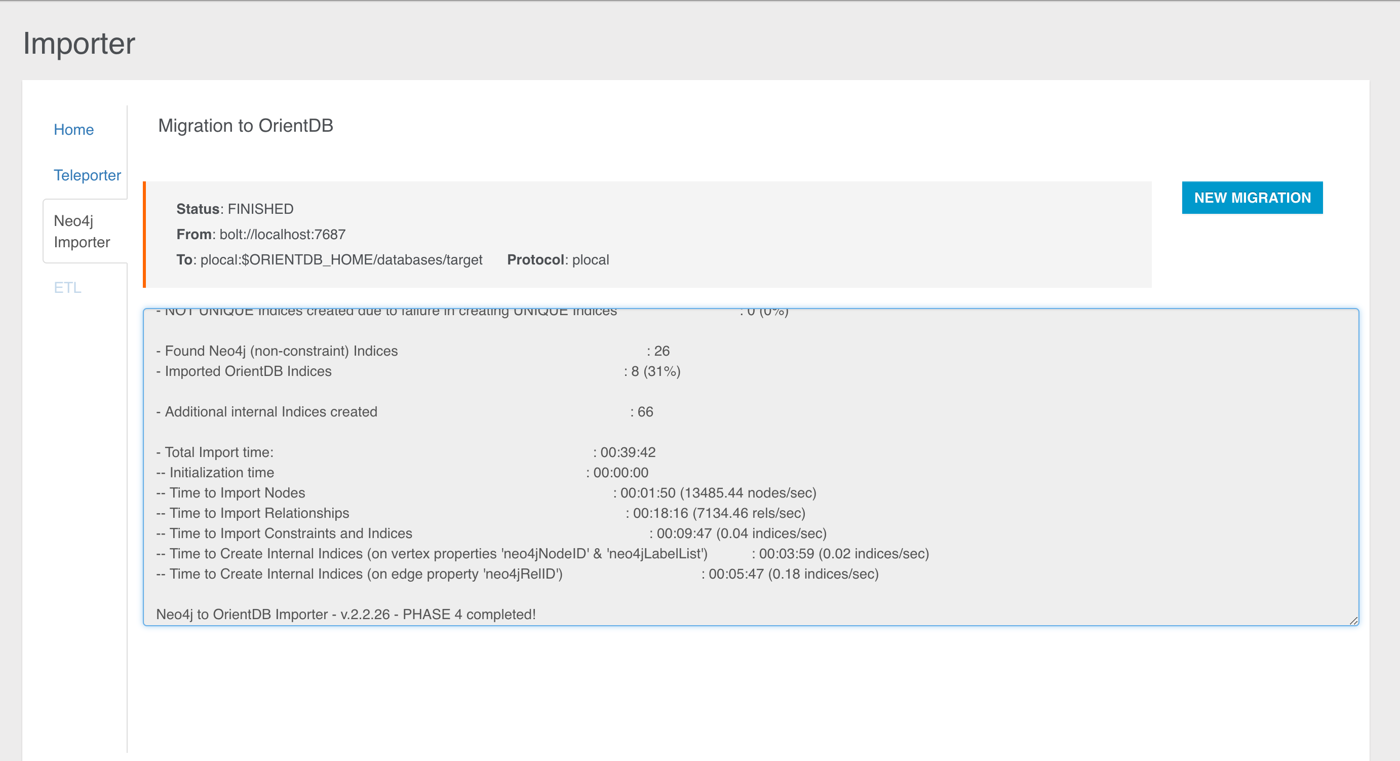 Overwrite Database, checkbox to overwrite OrientDB target database if it already exists.Create indices on edges, checkbox to create indices on imported edges in OrientDB. In this way an index will be built for each Edge class on'Neo4jRelId'property.