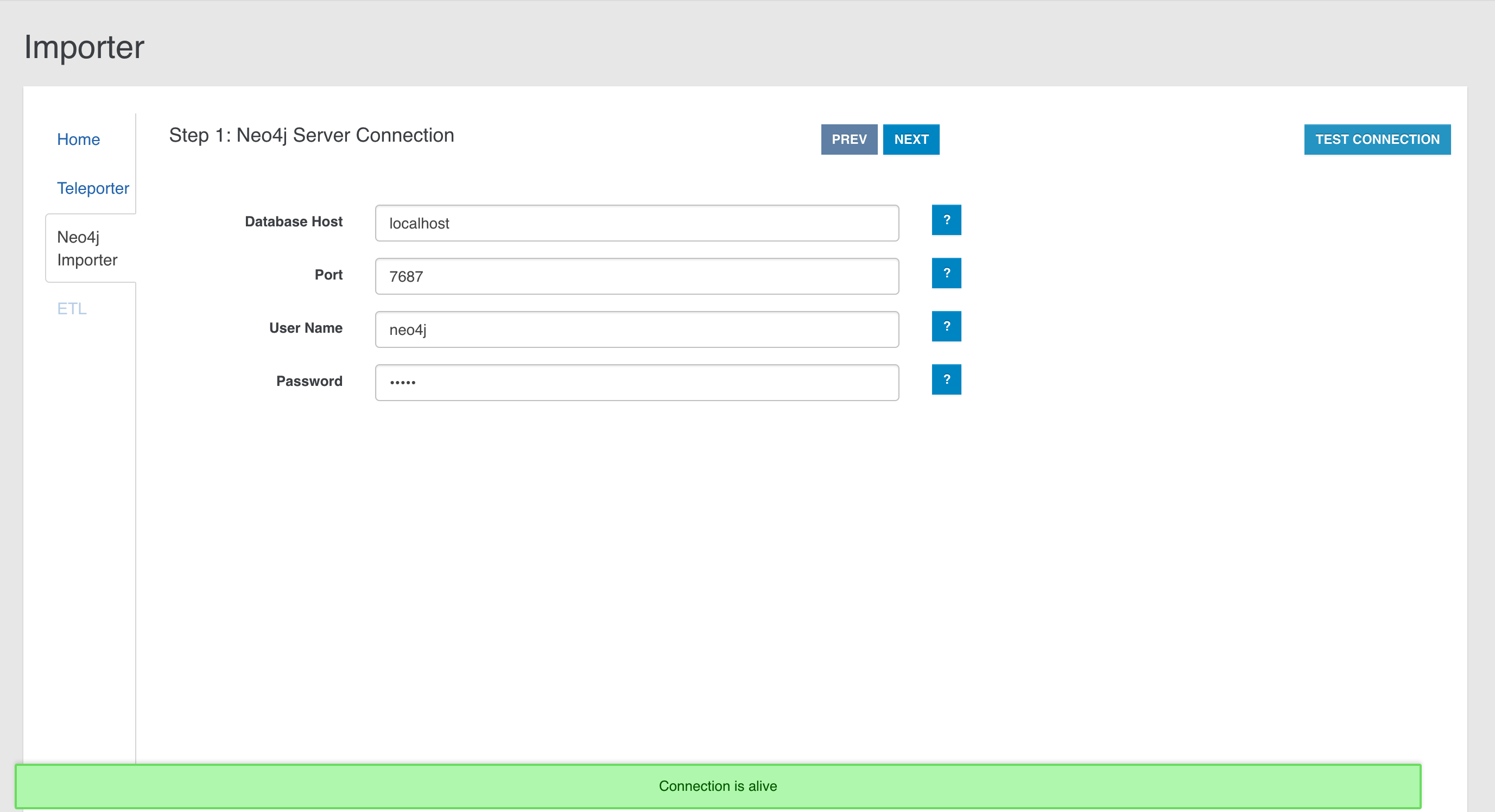 Database Host, as the address of the host where the neo4j server is availablePort, as the port where your neo4j server is listening for new connections via the bolt binary protocol (default port is 7687)User Name, as the username to access the neo4j serverPassword, as the password to access the neo4j server