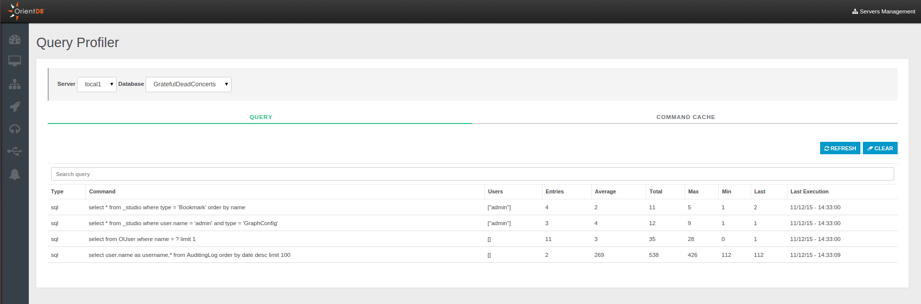 Type, as the query typeCommand, as the content of the queryUsers, as the users who executed the queryEntries, as the number of times the query it was executedAverage, as the average required time by the queriesTotal, as the total required time by all the queriesMax, as the maximum required timeMin, as the minimum required timeLast, as the time required by the last queryLast execution, as the timestamp of the last query execution