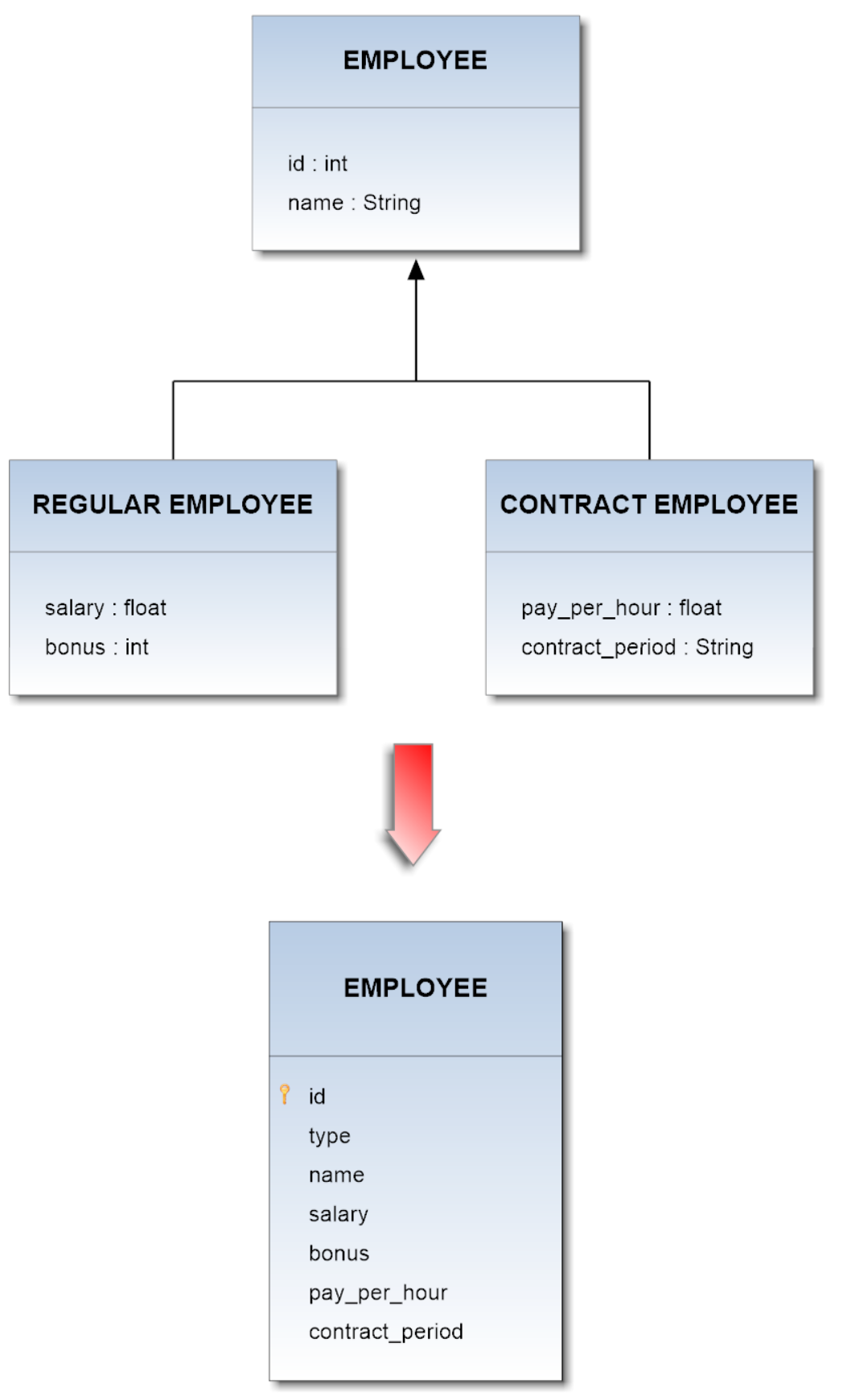 Now suppose you want to map the whole hierarchy given below into a coherent relational database schema. The Employee class is a superclass both for Regular_Employee and Contract_Employee classes. The type attribute acts as discriminator column.